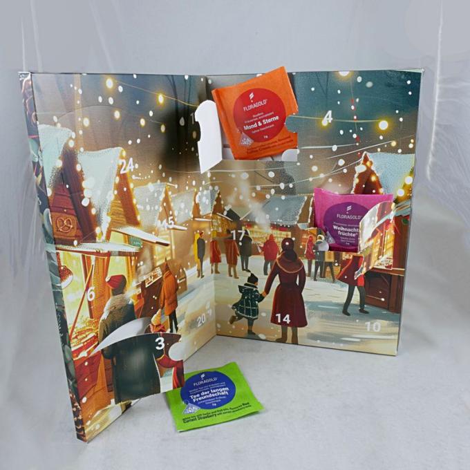 Befüllt mit 2x12 verschiedenen Sorten einzeln kuvertierter Pyramidenbeutel, versteckt hinter 24 Türchen. Der Kalender lässt sich aufklappen und aufstellen. Maße: Geschlossen: ca. 33x23x5,5 cm (L x B x T). Aufgestellt: ca. 93x23x1,3 cm (L x B x T).