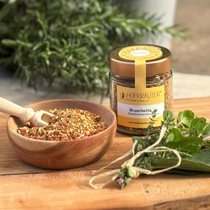 Getrocknete Tomaten-, Knoblauch- und Paprikaflocken, Basilikum, Oregano, Chilis und Meersalz – all das steckt in unserer Bruschetta Gewürzzubereitung. Sie verfeinert nicht nur deine Gerichte, sondern ist im Glas auch ein Blickfang in deiner Küche. Da sie auch auf dem Deckel beschriftet ist, ist sie auch ideal für deine Küchenschublade.