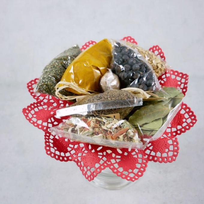 Schmückender Strauß mit 8 versch. Gewürzen. Unterlegt mit einen roten Papiermanschette. Der Strauß wird mit Bast ausgeschmückt. Eingebundene Gewürze: Lorbeerblätter, Suppenkräuter, Ingwerstücke, Curry, Kümmel, Salatkräuter, Wachholder, Muskat.