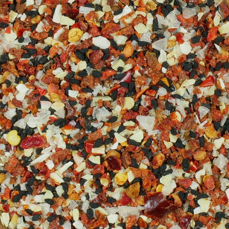 Sonnenflocken-Salz, Tomaten, Paprika, Schwarzkümmel, Knoblauch, Zwiebeln, Pfeffer, Chili.