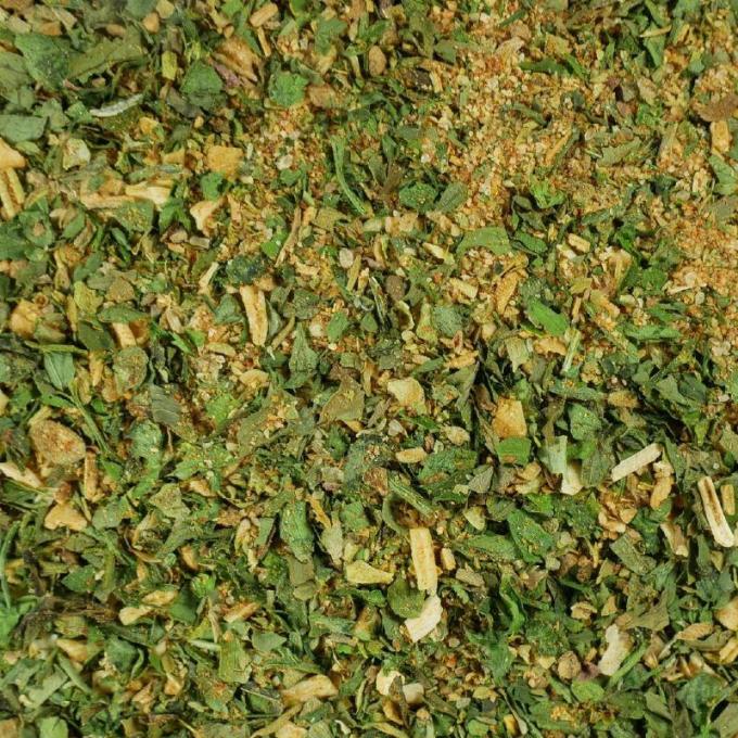 Zwiebeln, Liebstöckel, Knoblauch, Rosmarin, Pfeffer, Oregano, Petersilie, Muskatnuss, Kerbel, Majoran, SELLERIE, Basilikum, Paprika, Dillspitzen, Thymian, Tomaten, Estragon, Schnittlauch, Bohnenkraut, Champignon, Steinsalz (23%).