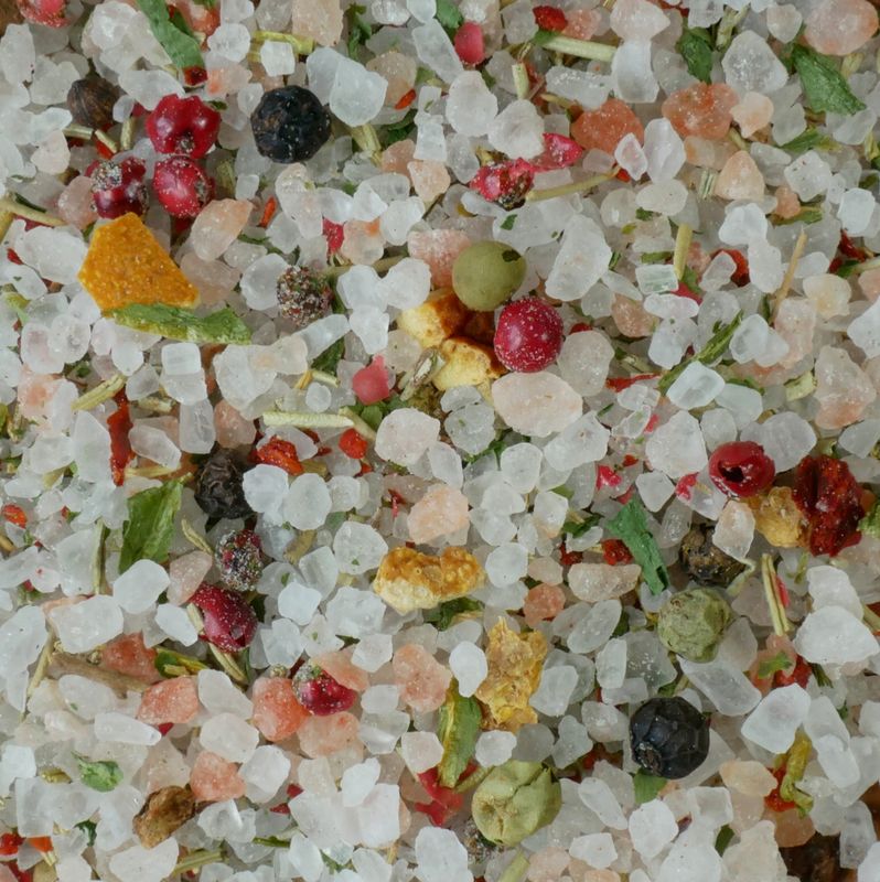Steinsalz, Punjab-Kristallsalz, Rosmarin, Rosalin, schwarzer Pfeffer, Zitronenschalen, grüner Pfeffer, Chilis, Bärlauch, Orangenschalen.