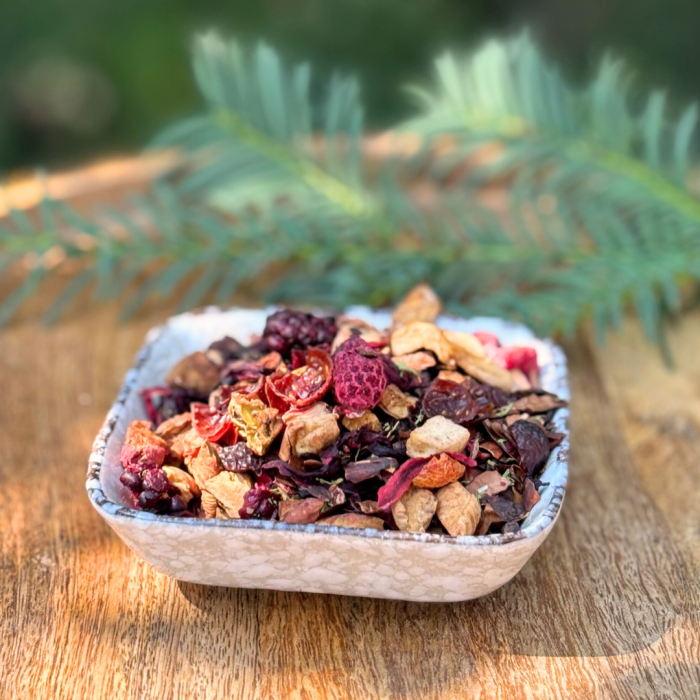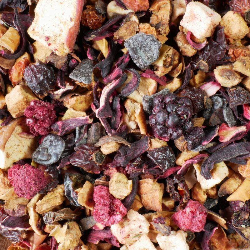 Diese fein abgestimmte Tee-Cuvée begeistert mit den Aromen der weltberühmten Schwarzwälder Tortenspezialität! Zu den typischen Früchtetee-Zutaten wie Apfel, Hibiskus, Hagebutten und Brombeere kommen noch leckere Schokoflocken, Kirschen, Himbeeren und natürliches Rum-Aroma dazu.