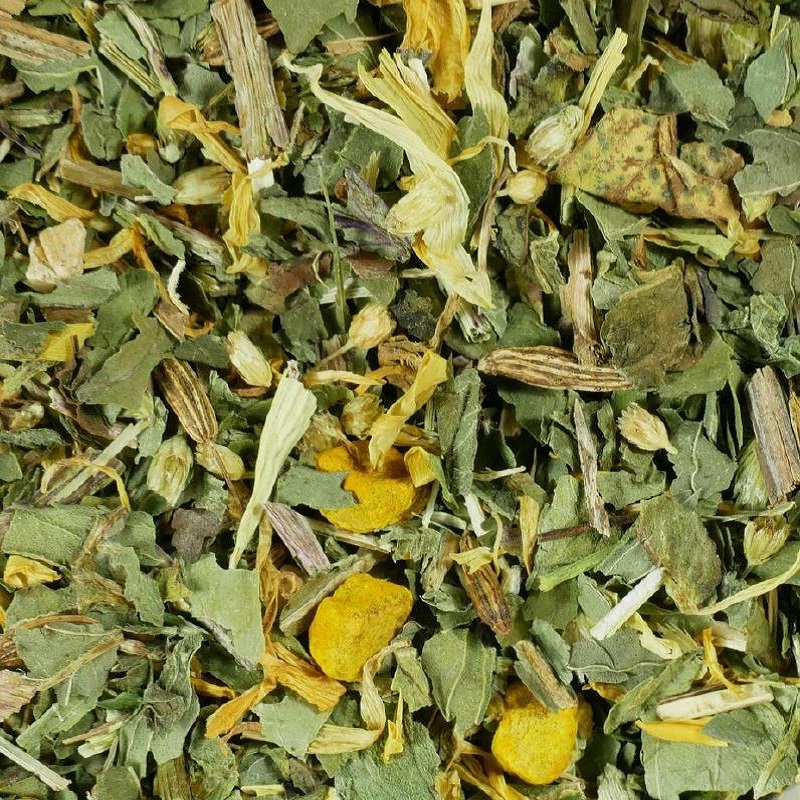Pfefferminzblätter, Löwenzahnkraut und Löwenzahnwurzel, Schafgarbenkraut, Kurkuma, Fenchel, Ringelblumenblüten, Süssholzwurzel.