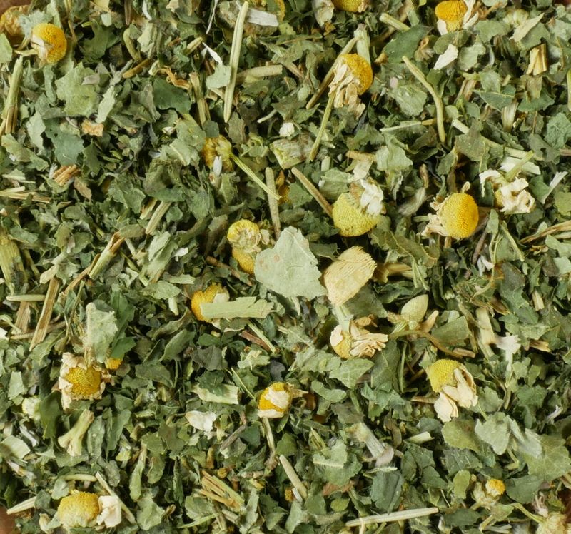 Brennnesselblätter, Kamillenblüten, Frauenmantelkraut, Rosmarin, Wermutkraut, Süßholzwurzel geschält und geschnitten.